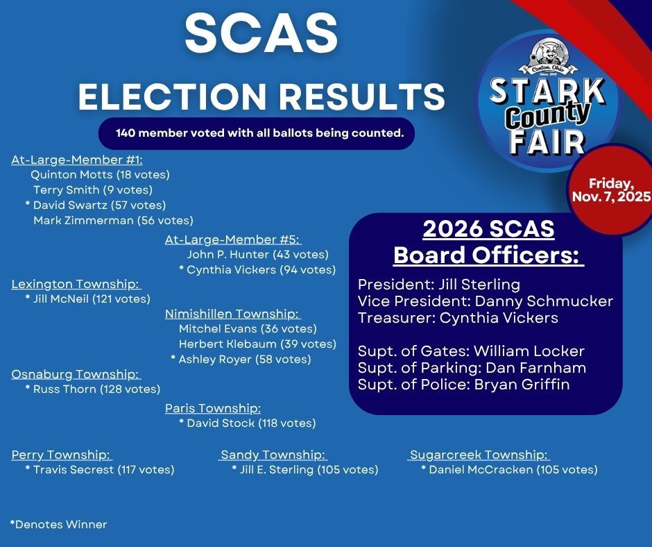 The Stark County Agricultural Society will hold an Election for members of its Board of Directors on Friday. November 6th, 2026. The election will be held at the Stark County Fairgrounds between the hours of 2:30 PM and 7:30 PM at the Senior Fair Office. Please bring your current membership card and a photo ID to vote. (per ODA Redbook).