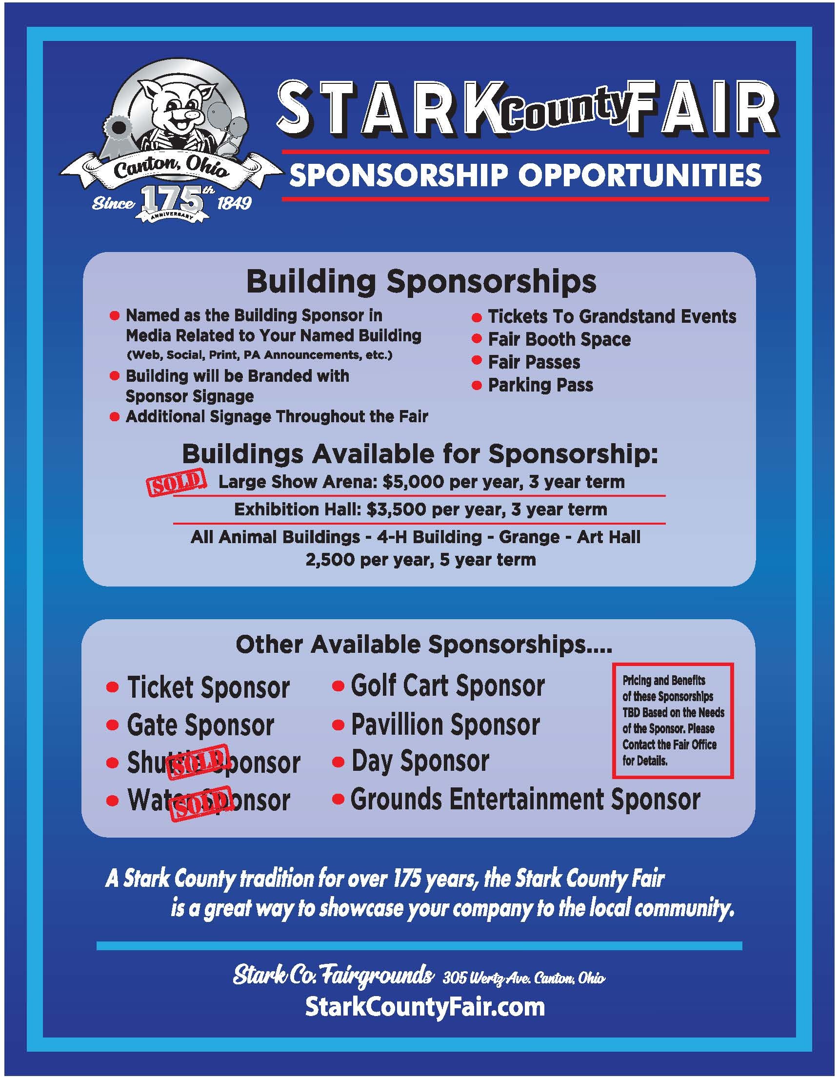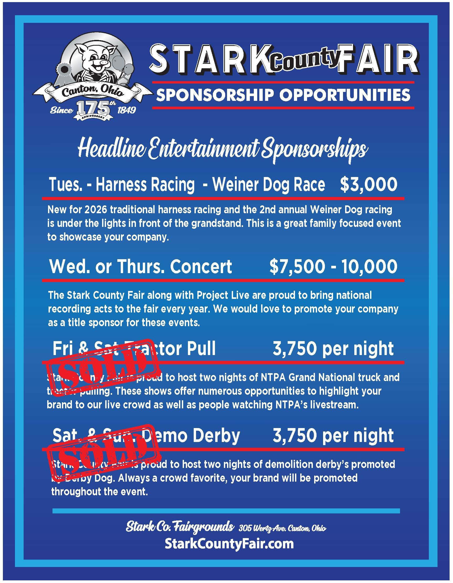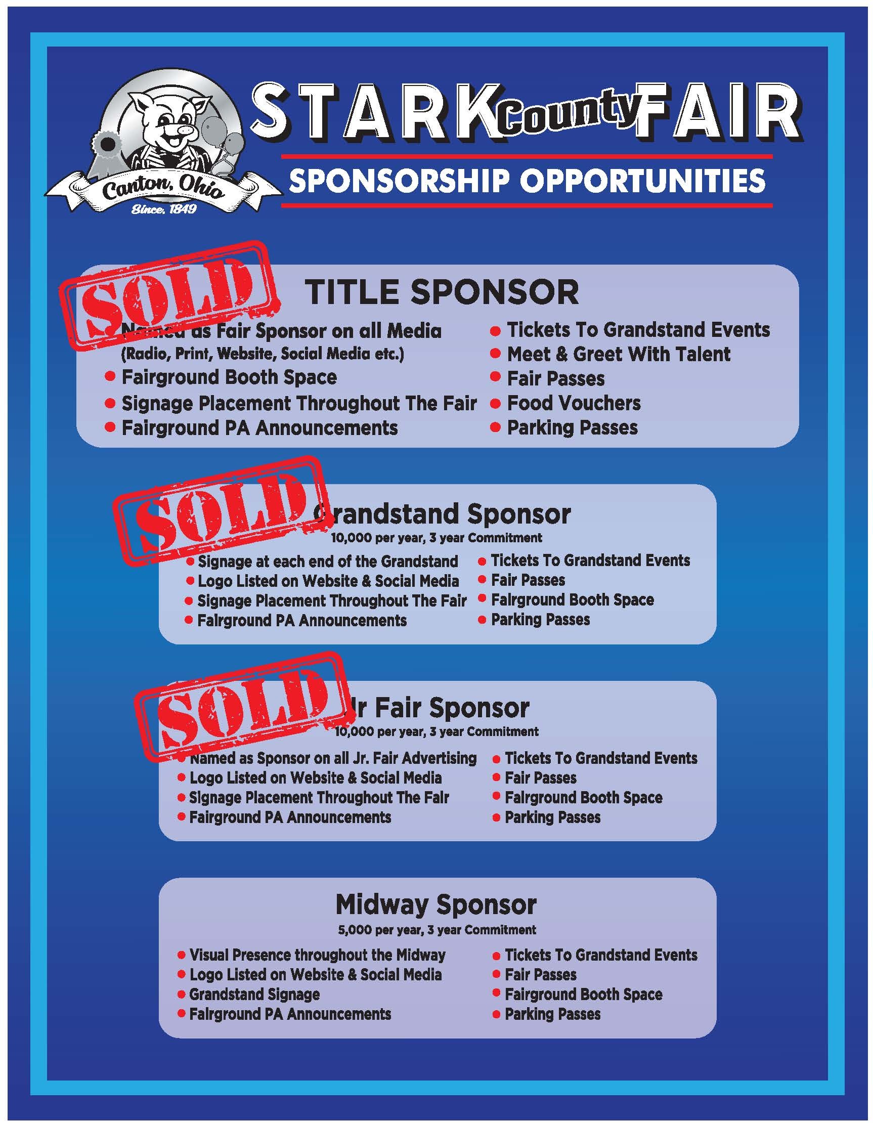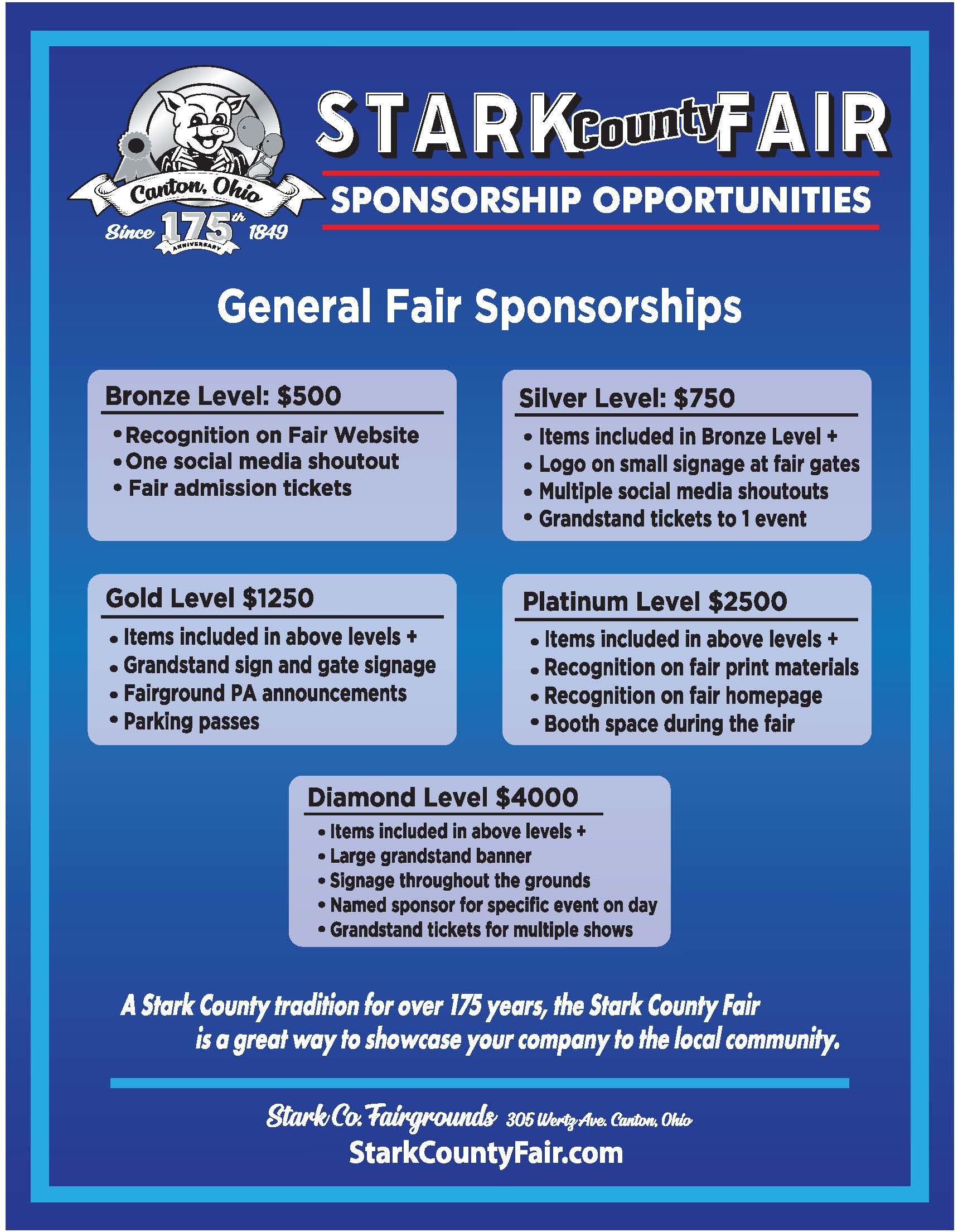 You’re invited to be part of Stark County’s largest family-friendly event. Rich in agricultural tradition, the Stark County Fair is an ideal marketing opportunity for companies and organizations to reach thousands of Stark County residents over seven days. Please contact the Fair Office at office@starkcountyfair.com or any Fair Board Director for sponsorship information.